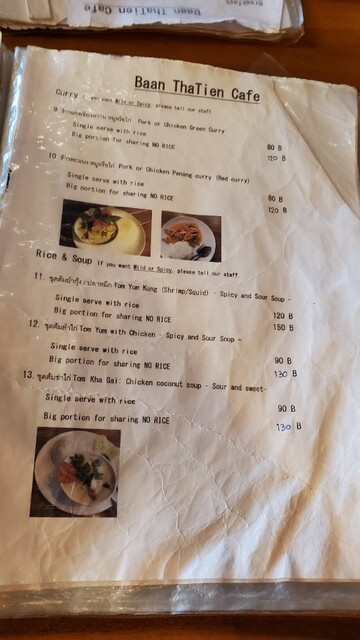 チャオプラヤー川左岸側に戻り、遅い昼食を取ろうと王宮エリアを散策。前回の訪泰で訪問出来なかった超有名なブルーなカフェでお茶した後に、お腹にたまるものを取ろうと、斜め前にあるコチラへ。店員さん4名以上。場所柄、外国人観光客が多いので、英語メニューです φ(..)