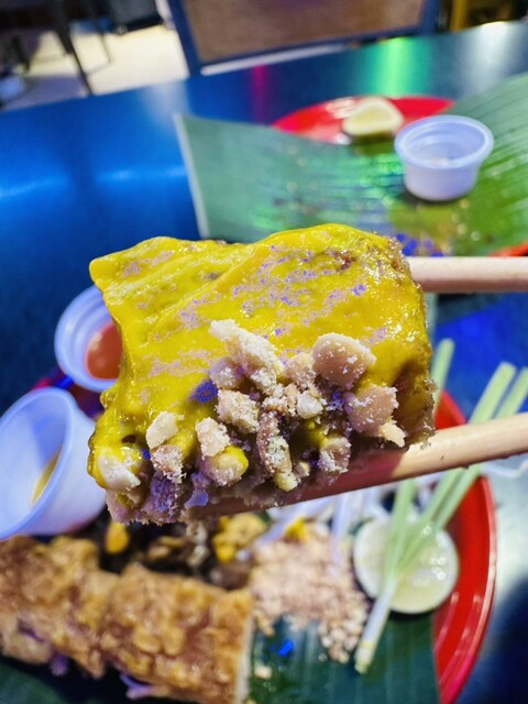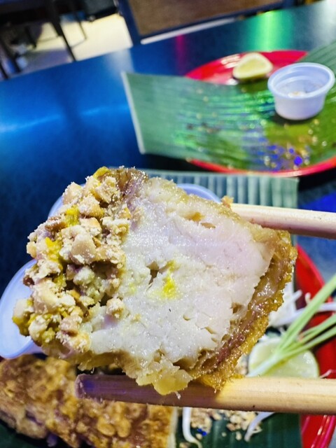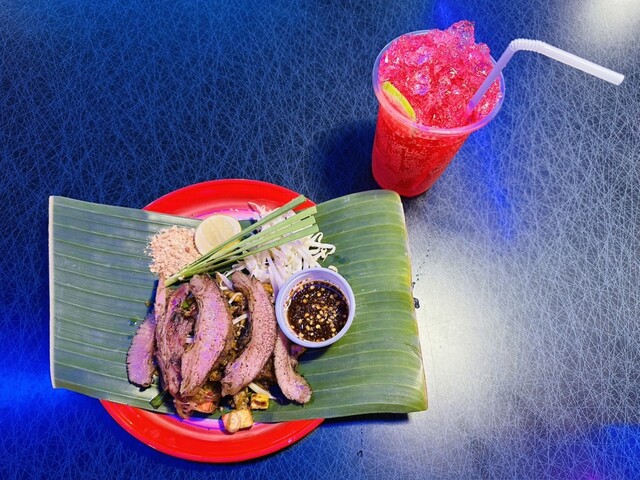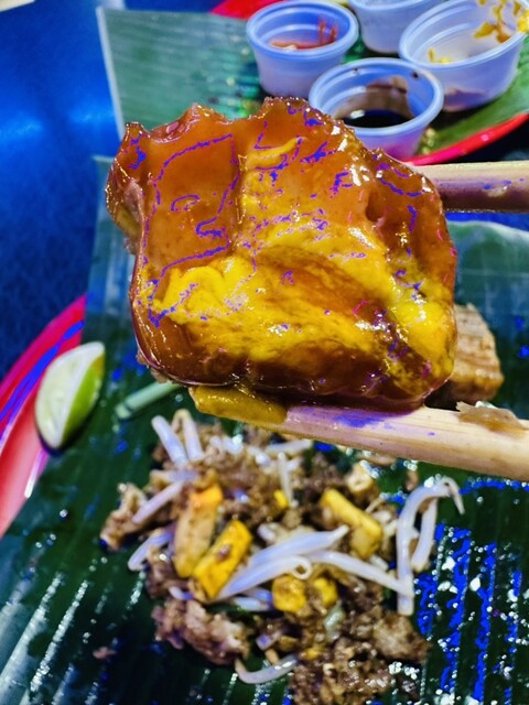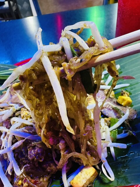 最初に注文した豚肉を載せたパッタイ(250バーツ)が今まで食べたパッタイの中で過去最高の美味しさ‼️