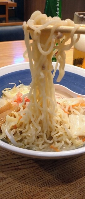 デフォルトのラーメンとビールで855円程。鶏白湯系の白濁スープに、中細縮れ麺。まぁ、味は普通ですね。具は、白菜・もやし・人参を軽く炒めたもの、チャーシュー、メンマ、紅生姜。そして、8の字が特徴的カマボコ「ハチカマ」。白胡麻が振り掛けてあります。ホテルに戻ってからも一杯やるので、こんなところでしょう(◔‿◔)