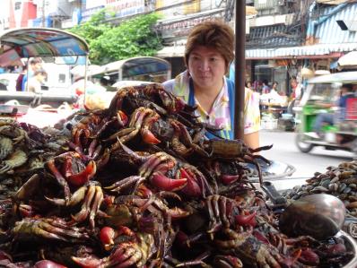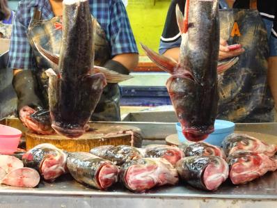 道の脇には魚介類、果物、衣類にスパイスと、あらゆるお店が朝から精力的に商売しています。