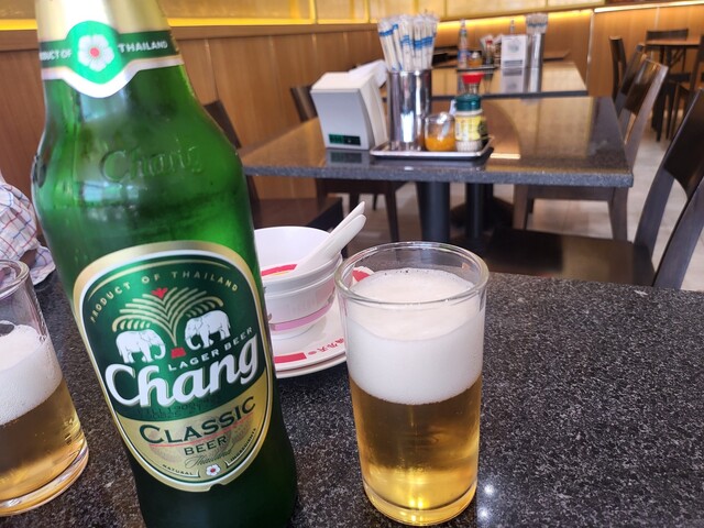 中華街のフカヒレ狙いで朝飯です。まずはチャンビールから。フカヒレスープと海鮮チャーハン、野菜炒め。炒め物が旨い。炒飯にフカヒレをかけるのもよい。全部で1100THB。