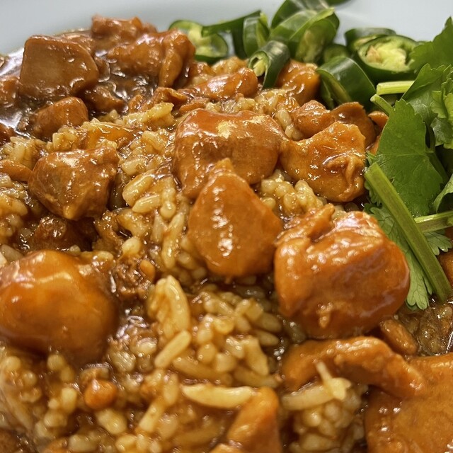 一言でいうとぶっかけご飯なのですが、これが本当に美味しいです!ざく切りのチキンを煮込んだものをごはんにぶっかけた感じ。グレイビーソースのような味で濃い味付け。子供から大人まで楽しめます。