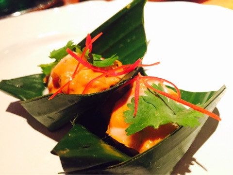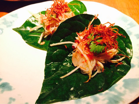 その他、全部で5種類の前菜はどれもバイマックルやチリが効いていたり、レモングラスの風味があるもの、不思議と噛むと酸っぱい味がする葉っぱなど。