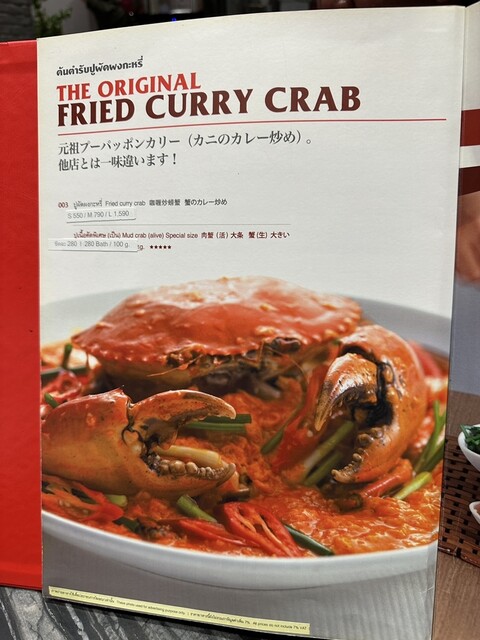 パッポンカリー発祥の店です。日本の首相など著名人も多々来店されてる超有名店です。バンコクに8店舗もあるみたいでいつもこちらのスラウォン店に来てます。自分は食べるの決まってて名物のパッポンカレーと空芯菜とチャーハンは必ず頼みます。量も多いのでMで二、三人前はあるので注意が必要です。写真はどれもMサイズです。