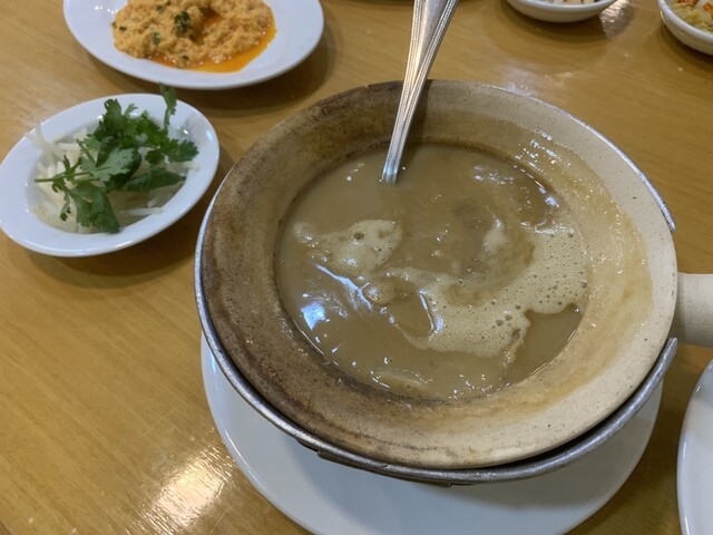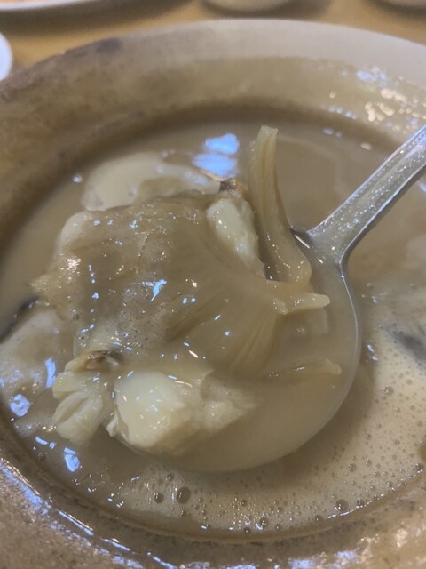 1番目から茶色のフカヒレスープが土鍋でグツグツと出てきて、味はとろとろの濃厚な豚骨の様なスープで美味っ!!
