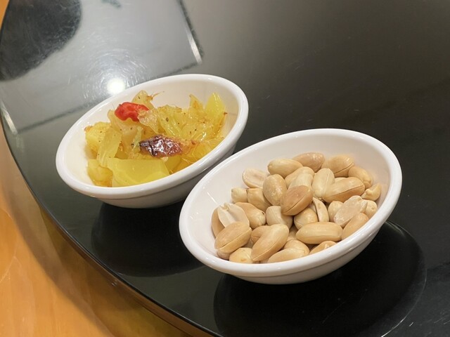 ビールを頼むとピーナッツと白菜の漬物がおつまみで出てきます。