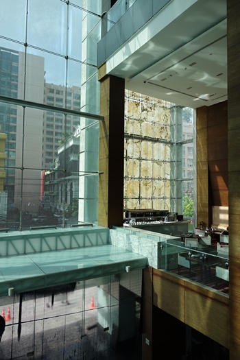 朝食会場は2F バンコクは殆どのホテルが朝食付きです フロントから吹き抜けの採光差し込むスペース