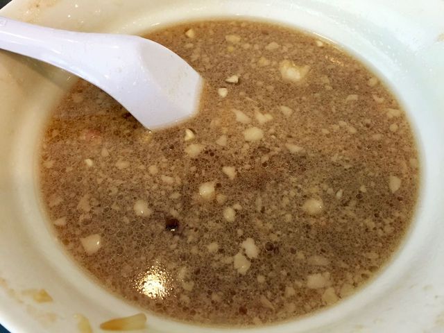ニンニクを丼縁に沿って散らし、外側から底に向けて押し込みつつスープに馴染ませた後に、箸を突っ込んで奥からガシっと!