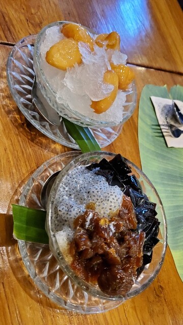 タイバーツがかなり余っていたので、最終日と言うこともあり、私が支払い担当(`・∀・´) アルコール販売は17時からなので、あと30分ほど我慢です。先ずは、実まんまのココナッツジュースと、かき氷を頂きます。タイではメジャーなサクラヤシのシロップ漬け、仙草ゼリーが乗っかったかき氷。冷た~い(*´Д`*)