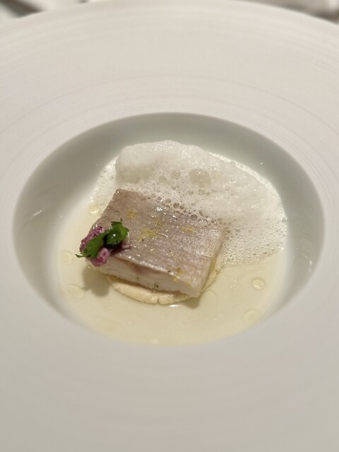 ⑫アトランティックヒラメの骨付きローストフリカッセ ダイコクオオミゾ貝と緑豆の乳化ソース キャビア