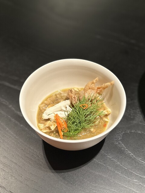 ⑩オック川の川海老カレー、トマト、コブミカン、ローストライス添え