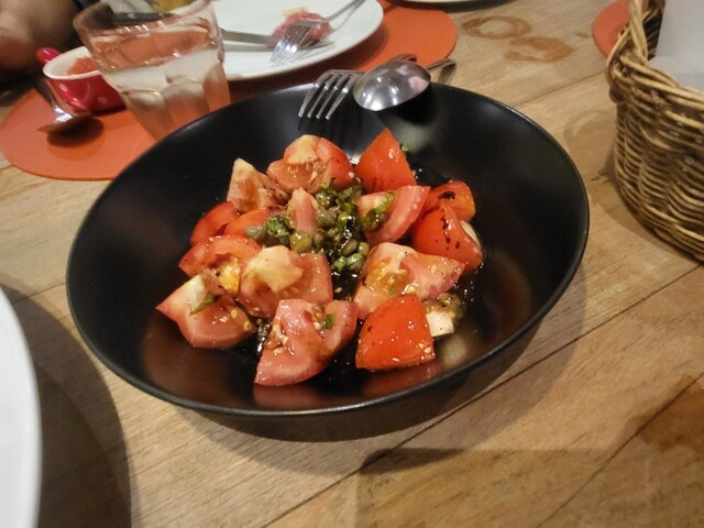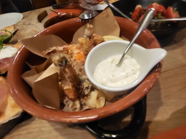 エビのフリットにトマトサラダ、ピッツァにボンゴレ、トリュフソースのパスタ、ラザニアを少しづつ食べてレモンのジェラートでさっぱり。
