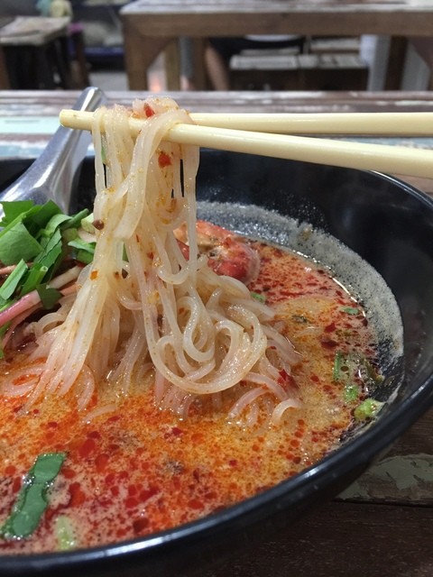 メニューの表紙にあったのは、後から調べてみると「トムヤムメーナームクンナムコン」という麺のようですが、これが実にウマい。濃厚なエビのエキスにココナッツミルクが混じり合うコクがたっぷりのスープには、レモングラスの香りや酸味がよく効いていて、辛さはほとんど感じられません。旨味と甘味と酸味が複雑かつ重厚に重なり合った、日本で食べるトムヤムクンとは全く別モノの、おそろしくウマいスープです。そのスープにモッチリとからむパッタイのような麺が、また美味しい。