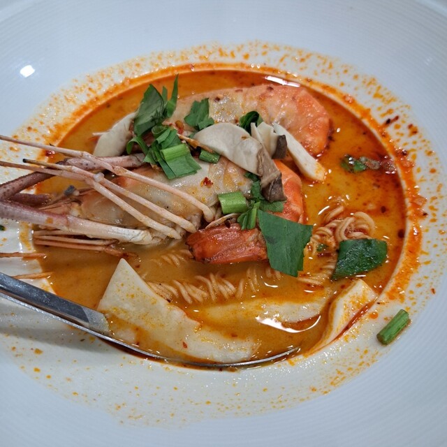 ココナッツミルク入りの円やかなトムヤムスープのナム...