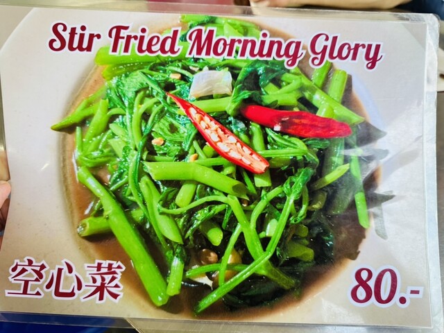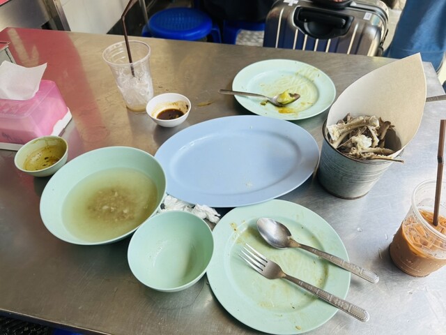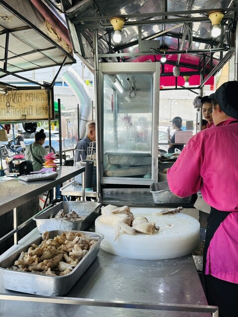 また空芯菜を注文すると数軒隣の #ゴーアンカオカームープラトゥーナム(#โกอ่างข้าวขาหมูประดูน้ำ)の店員さんが出前していた