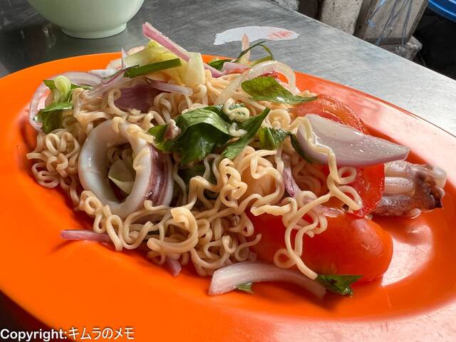 いわゆるインスタントラーメンの麺を使ったようなものではあるが、それなりに海鮮が入っており独特の酸味とレモングラスのような香草感のある、いかにもタイという感じの味わい。