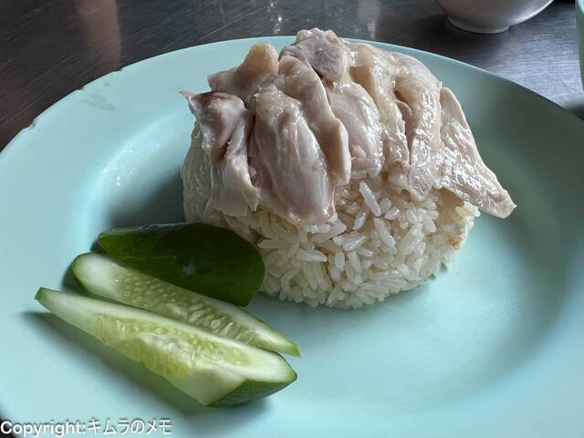 「カオマンガイ」は鶏肉・ご飯・きゅうりと非常にシンプルなビジュアルではあるが、味わいはなかなか。