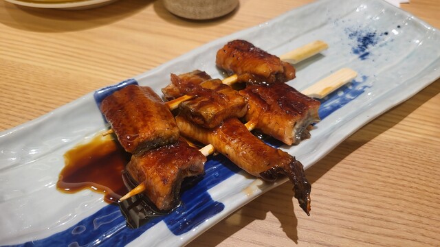 まずはビールにバイ貝、野菜漬物、玉子焼き、うなぎ串焼き。