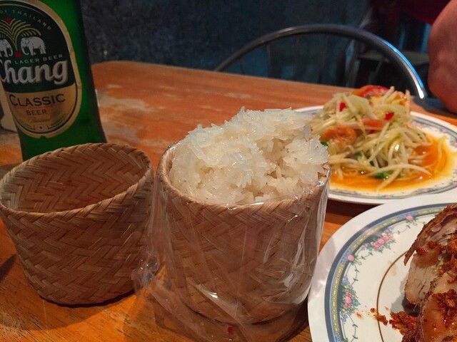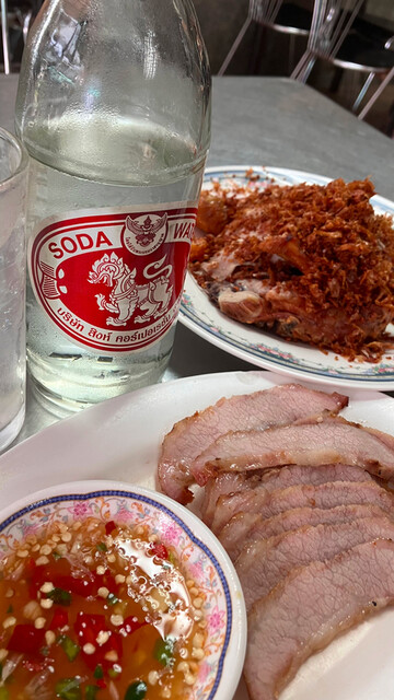 夕飯をソイポロフライドチキンでいただきました。フライドチキンという名前ですがイサーン料理の店でした。フライドチキンだけでお腹いっぱいにしてしまうのはもったいないので、フライドチキンは避け、ソムタム、豚...