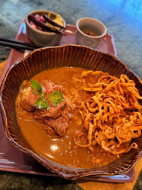 今回は、前に食べて印象に残っていた”Sliced Beef Khao Soi”をチョイス。ココナッツの濃厚なスープ、レモングラスやスパイスも効いて、香りだけでも食欲をそそる。茹で麺と揚げ麺の2種を食べ比べつつ、薄切りビーフも合わせる。素晴らしいクオリティ。このカオソーイは嫌いな人がいないと思う。