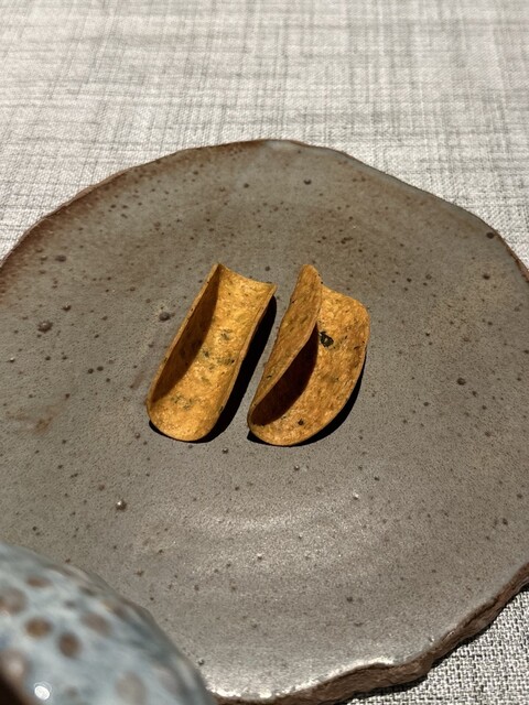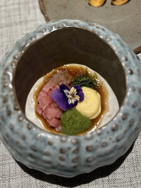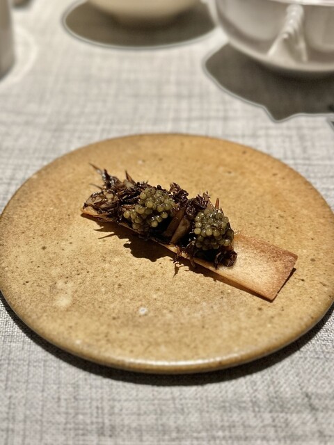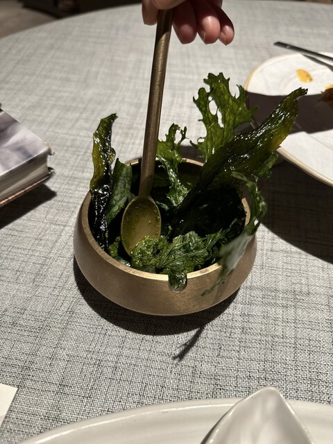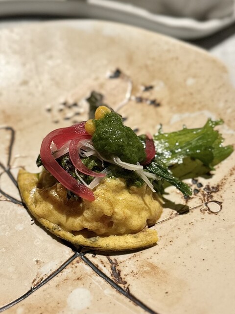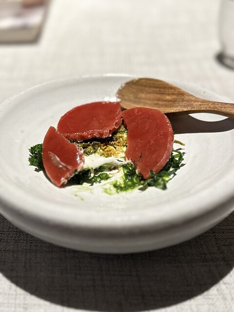 ①韓国海苔の様なカリカリした海藻に香草クリーム、ビーツなどから作った赤いソルベシート