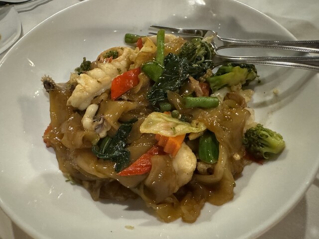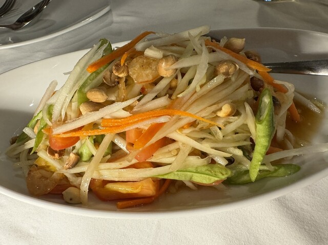 美味しいと評判のチキンマッサマンカレー、青パパイヤのサラダ、ドランクンヌードル、コーンの揚げ物を注文。