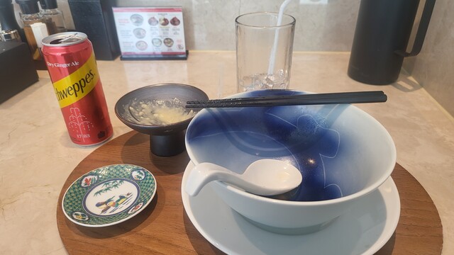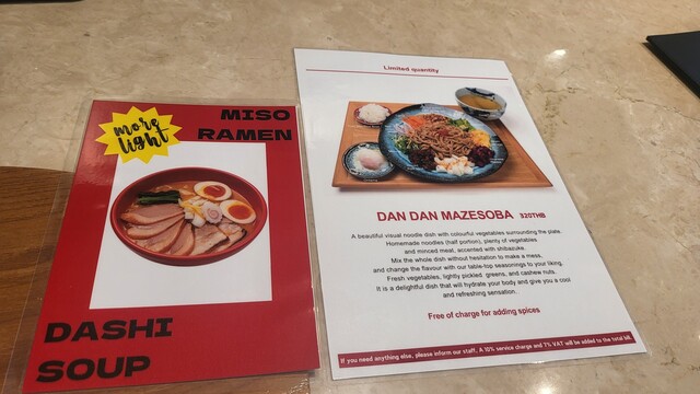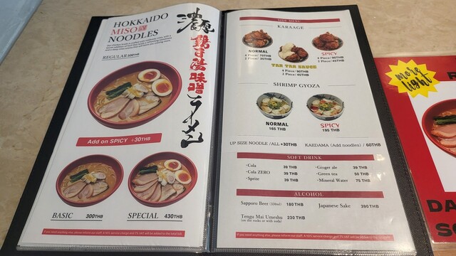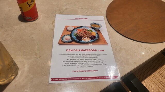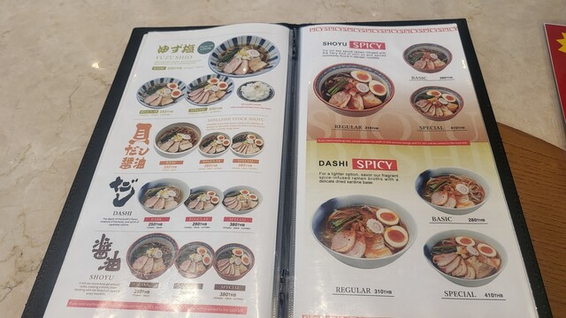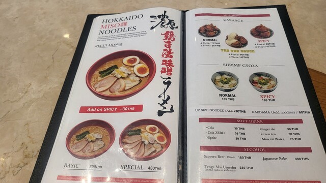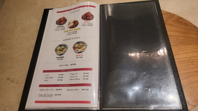 SHELL FISH SHOYU BASIC 250THB, DAN DAN MAZESOBA 320THB, KARAAGE NORMAL 2 PIECES 35THB, Ginger ale 39THB(VAT別)