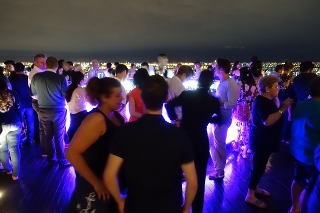 わ、絶景。こっちのほうが全然広い。オープンエアのレストラン席を通り抜け建物の先端に向かうと円形のバーカウンターがあり、皆、酒を片手に写真撮影を楽しんでいます。