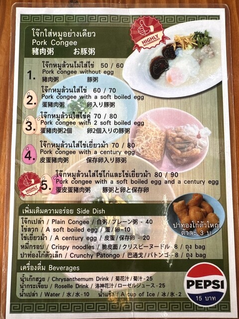 豚肉のミンチと卵が入ったお粥で60バーツ。お酒を飲んだ翌朝の朝食にピッタリである。