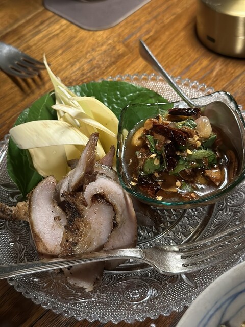️豚ほほ肉のグリル、魚醤とバナナの花添え