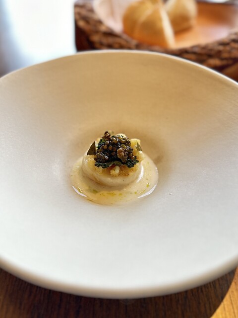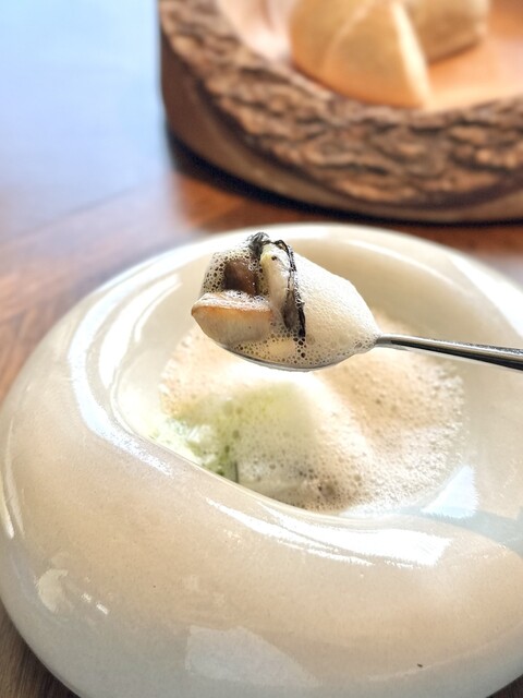 ⑦牡蠣のバーベキューとキングトランペット茸 チャイブオイル 酵母の泡