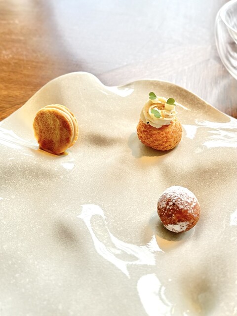 繊細ですね~。タイでこんな繊細なフレンチを食べられるとは思ってませんでした。野菜や魚は地物を使っているそうです。珍しい素材と言えば「ヘイク」「キングトランペット茸」ぐらいで、その他はなじみ深いものがほとんど。にもかかわらず細工が細かく、味と香りの調和が見事なのでとても美味しいですね。自分にとってのスペシャリテはラングスティーヌ。かなり大きくて立派なものを使っていますね。何といってもたっぷりかかっているソースが素晴らしい♪ サフランと黒ニンニクのダブルソースはお互いに主張の強い香りですが、見事に融合していました。メインのハトも抜群の火入れでキヌガサ茸の頭の部分だけを使った贅沢なガロ二。桑の実のソースもちょっとした変化球ですね。デザートから小菓子までどれをとっても繊細な細工が施され、小さいながらも色々な香りが楽しめます。