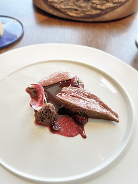 • Côte by Mauro Colagreco - ⑪鳩肉の蒸し焼き キヌガサダケの頭 桑の実ソース 鳩肉のジュ