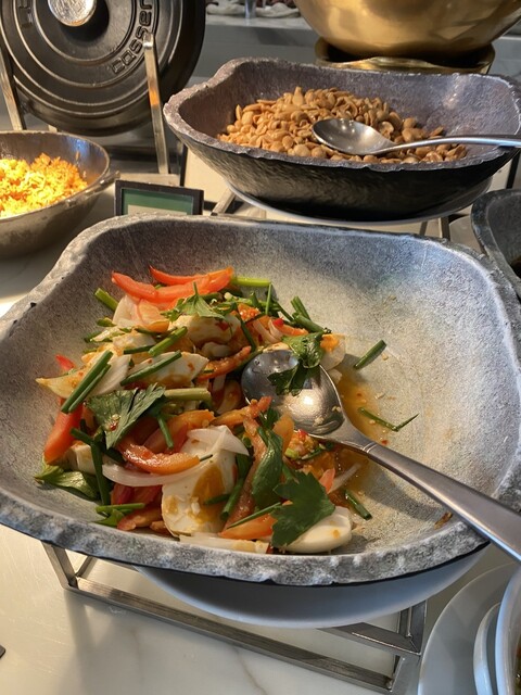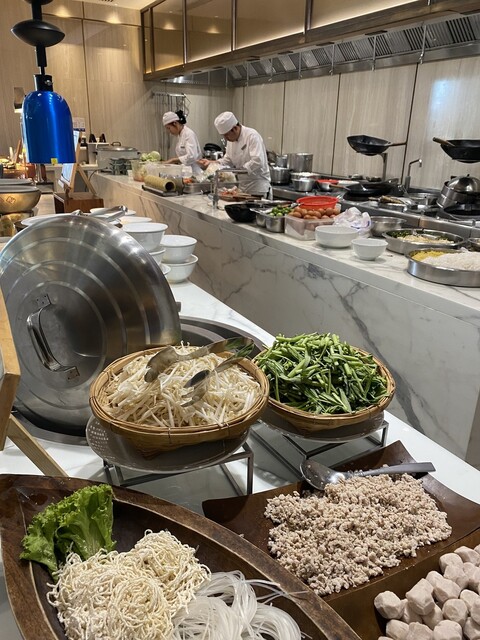All day culinary with a comfortable indoor and outdoor seating with river view terrace. Interact with lively five display kitchens, from where chefs entertain their hungry guests with blazing wok-fired dishes from Asia, steamed fish, simple sliced sushi, and other Mediterranean delicacies. |