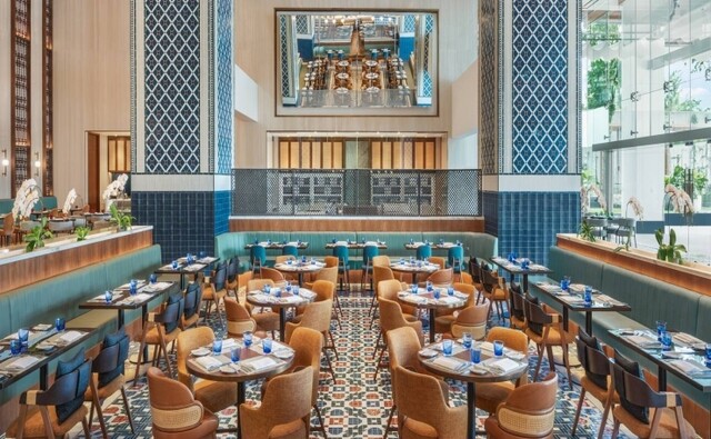 All day culinary with a comfortable indoor and outdoor seating with river view terrace. Interact with lively five display kitchens, from where chefs entertain their hungry guests with blazing wok-fired dishes from Asia, steamed fish, simple sliced sushi, and other Mediterranean delicacies.