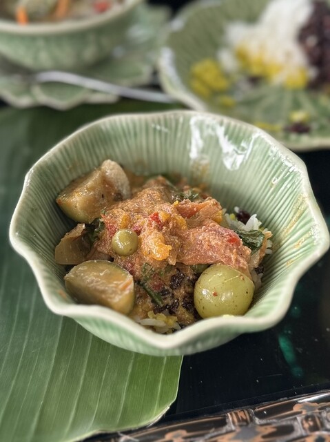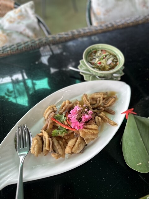 凄い量ですね。明らかに1人で食べきれる量ではないw おそらく2名以上の予約を前提としているのではないでしょうか。ミヤンカムはいろんなお店で食べたんですが、やっぱり日本国内よりタイ現地の方が色んな香りが混ざっていて絶対的に美味しい。もちろんここのミヤンカムも美味しいです。カボチャを器にしたダックのレッドカレーは高級感がありますね~。ブドウが入っていて甘酸っぱさを加えています。カレーのスパイスも割とフレッシュ感がありますし手が込んでいますね。カボチャの身を崩して甘味を感じながらか食べるレッドカレー。唐揚げや炒め物はまぁ普通に美味しいという感じですかね。全体的に伝統を重んじた料理ですね。物珍しさはない物の、安定的に美味しい料理を美しい景色の中でゆったりと頂ける。そういうお店でした。