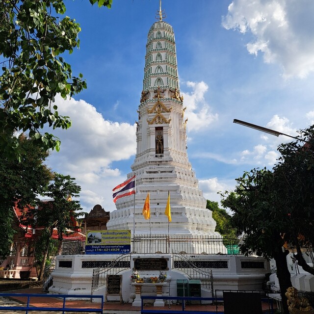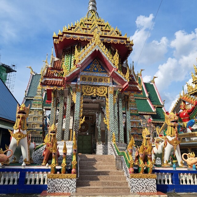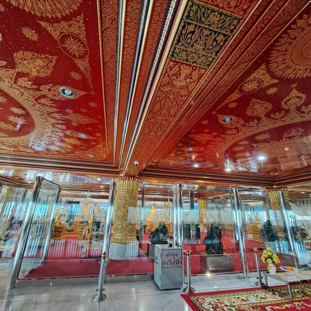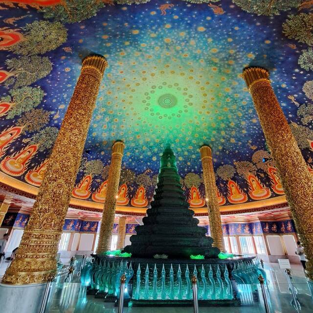 本堂や5階建ての大仏塔の中は1階がタイの芸術や文化遺産の展示、2階が瞑想ルーム、3階は博物館、4階はルアン・ポーソッド師の像、5階が仏舎利奉安塔と仏伝図があり、特にエメラルド色の仏舎利奉安心塔と仏伝図は素晴らしく、ガラスで出来た蓮の花や蛇神ナーガの装飾、最上部に鎮座している小さな仏像も素晴らしいです。