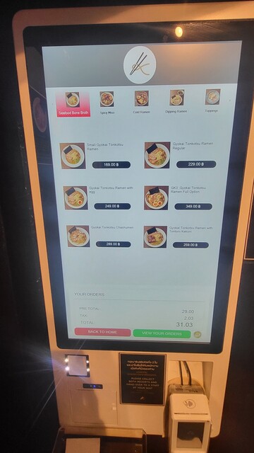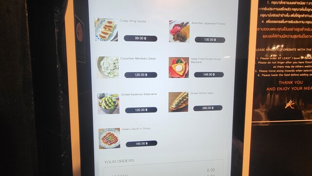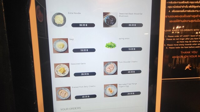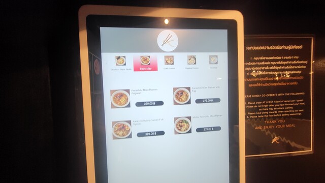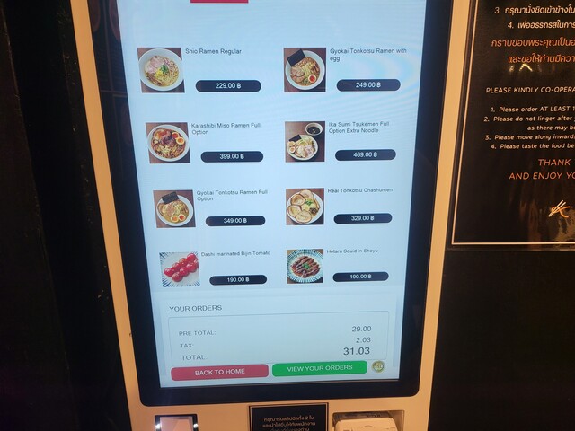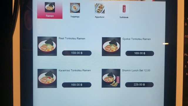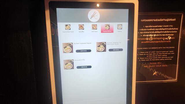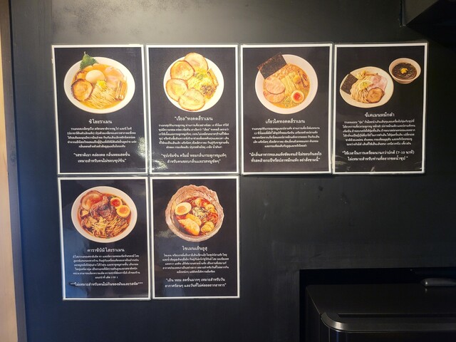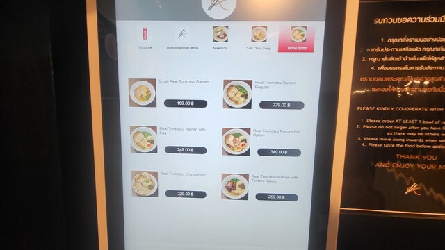 Small Shio Ramen 169THB, Gyokai Tonkotsu Ramen Full Option 349THB, Ajitama Ika Tsukemen 349THB, Asahi99THBx2(VAT別)