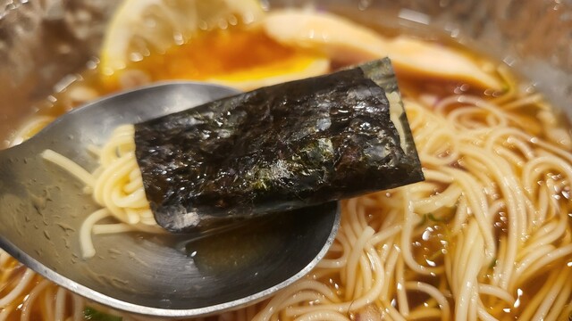 スープは魚介出汁のサッパリ醤油味で器の外から氷で冷やしているのでスープが薄まらないのがよい。