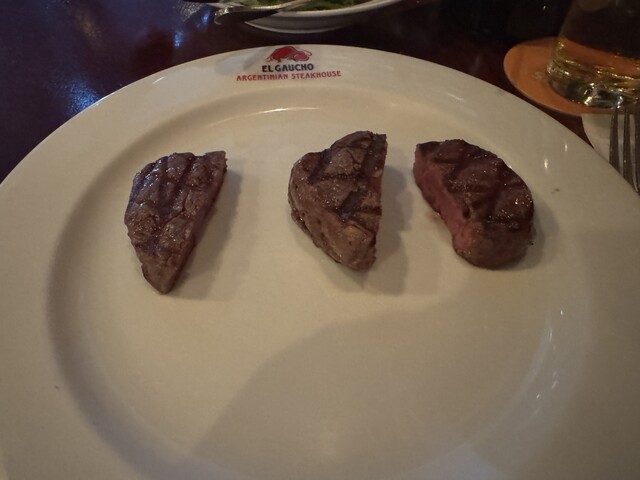 カンボジアに2泊してタイへ移動、シンプルにお肉が食べたいと思い、人気のこのお店を予約しました。バケットとフライドオニオンがまず運ばれて来ます。注文は①FILET TRIO(アンガスビーフ、アメリカビーフ、和牛のフィレ肉)②グリーンサラダ③マッシュドポテト④トリフマカロニ&チーズ、⑤ロブスターとカニとお肉のスープ等を妻と二人でシェア。シェアすると言えば、切り分けてお皿に盛ってくれます。あとはビールとグラスワインでした。最後に、キャラメルのお酒?(プリンのカラメルみたいなの)確かにお肉の焼き方、風味、柔らかさ、美味しかったです。サービス料10%は付いてました。お店の雰囲気も素敵です。しかし、円安だとは言えかなりお高いお店です。