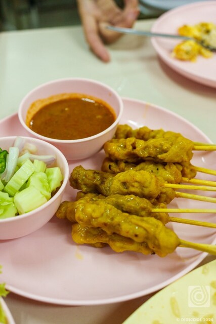 「ไก่สะเต๊ะ(ガイ・サテ)」はピーナツダレをつけて食べる焼き鳥。サテといえばインドネシア料理だと思っていたけど、同じ名前でタイにもあるんですね〜。ゴマダレっぽい甘めのタレが癖になる美味しさです。
