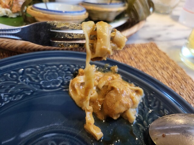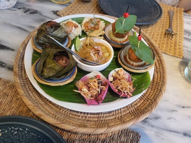 日曜夕方予約無しで行ったら奥へ通されました。前菜盛りはお得でカレー麺付。マッサマンカレーはチキンで甘め。プーパッポンカリーはクラブでこちらも辛くないです。カニの身がとりにくいのと二人で量が多すぎた。米は2種類ありおかわり自由でミックスも可能。ソムタムも旨かった。