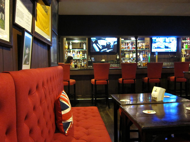 店名から分かる通りに、サッカー中継などをお酒を飲みながら楽しめるスポーツバーで、店内各所にある大型液晶テレビではプレミアリーグのライブ放送などをやっています。