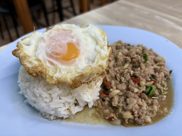初訪問は10月初めの平日の朝7時半過ぎ。場所はBTSアソーク駅東口を出てそのままスカイウォークを一番東まで歩いて北方向へ降りて、さらに次の4つ角まで東へ100mほど進み、GSの角を曲がって50mほど北へ進んだ左手にお店はあります。駅から4~5分です。