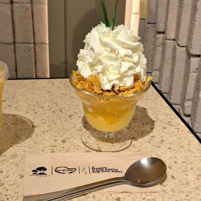 たっぷりの生クリームの下にはマンゴーアイス、コーンフレーク、マンゴーの身が入っており、これ1つで4つの味が楽しめる様になってます。