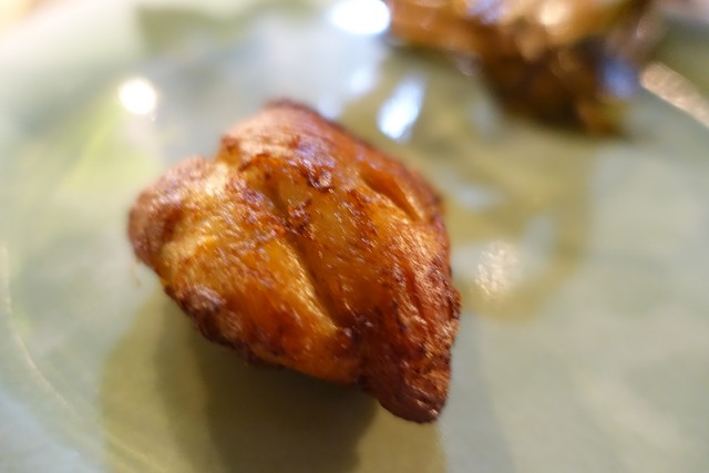 コームーヤーン。豚のノド肉のあぶり焼です。喉の定義とは外皮なのか食道なのか首なのか諸説ありますが、食感としてはトントロであり、程よく脂が乗った豚肉という印象。