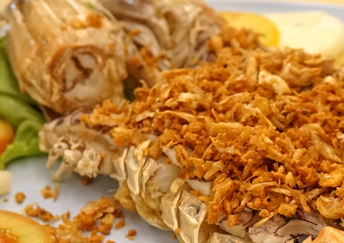 シャコを塩とニンニク、タイの唐辛子と合わせて~サッと揚げたお料理です