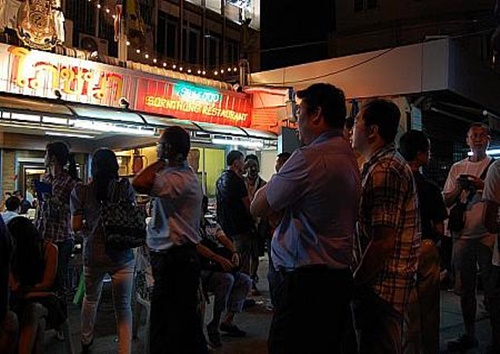 常連のようなタイのグループに、ガイドブック片手に待つ旅行者の姿 店の前の道路まで人が溢れています