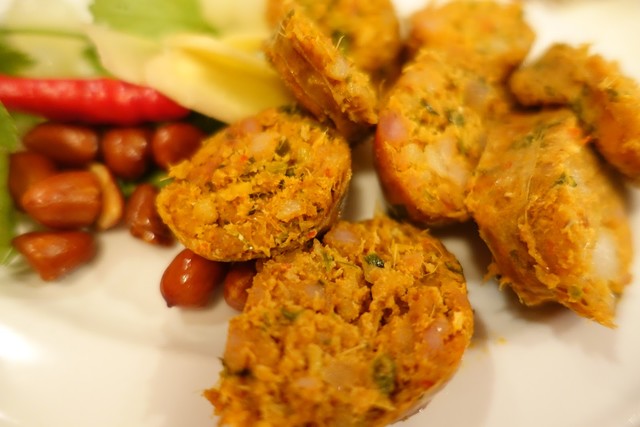 チェンマイソーセージ。脂が豊かな豚肉にレモングラスなどのハーブやタマネギ、ニンニクなどがたっぷり入ったハンバーグのような代物。ターメリックで色づけされており、およそ一般的なソーセージとは異なりますが、そのスパイシーな味覚に釣られてビールが進みます。