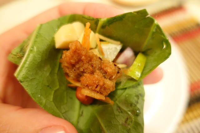 ミャンカム。香り強い葉っぱに、豆やらココナッツやらオリエンタルな食材を包み込み、タマリンドベースのタレをつけて賞味する伝統的な前菜です。
